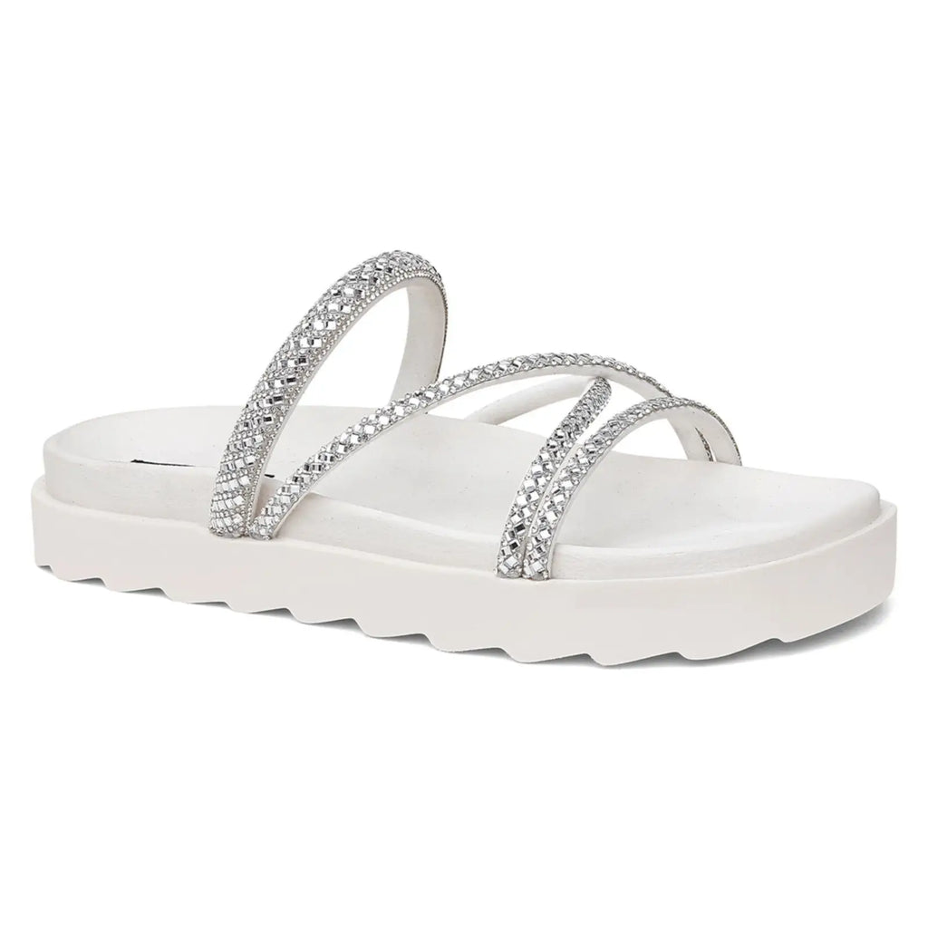 Papete Feminina Branca Strass Brilho Sandália 4 Tiras Flat Conforto